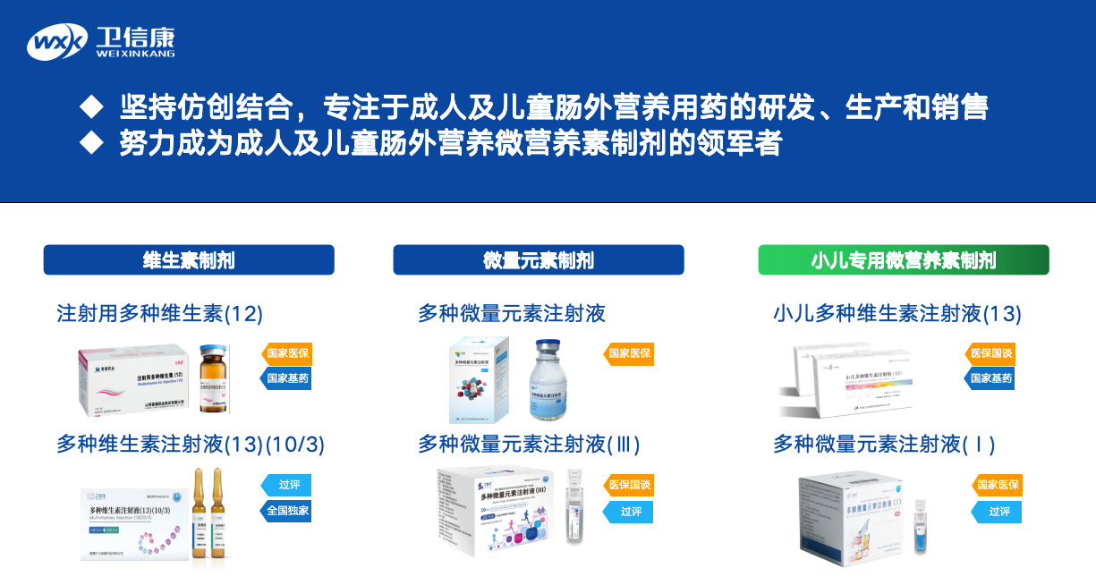 多年來,衛(wèi)信康深耕腸外營養(yǎng)微營養(yǎng)素制劑的研、產(chǎn)、銷一體化運(yùn)營,產(chǎn)品管線覆蓋了成人和兒童領(lǐng)域的多種維生素、微量元素等制劑品種,目前已成為該細(xì)分領(lǐng)域的國內(nèi)優(yōu)勢企業(yè)。已研發(fā)上市的核心產(chǎn)品涵蓋:注射用多種維生素(12)、多種維生素(13)(10/3)水針/粉針、多種微量元素注射液、小兒多種維生素注射液(13)、復(fù)方電解質(zhì)注射液(V)等。