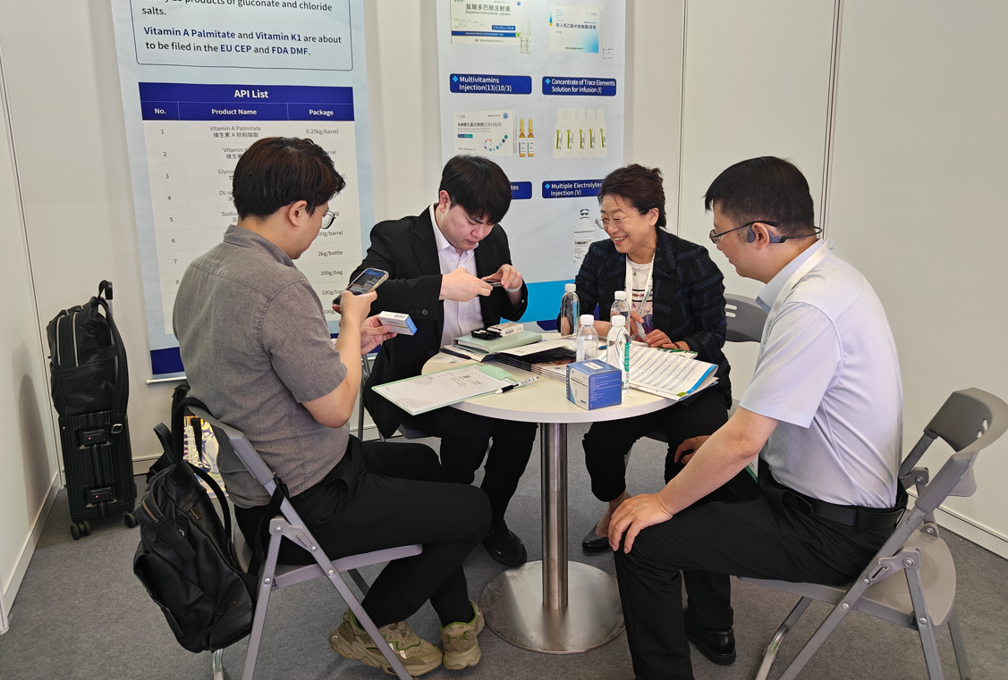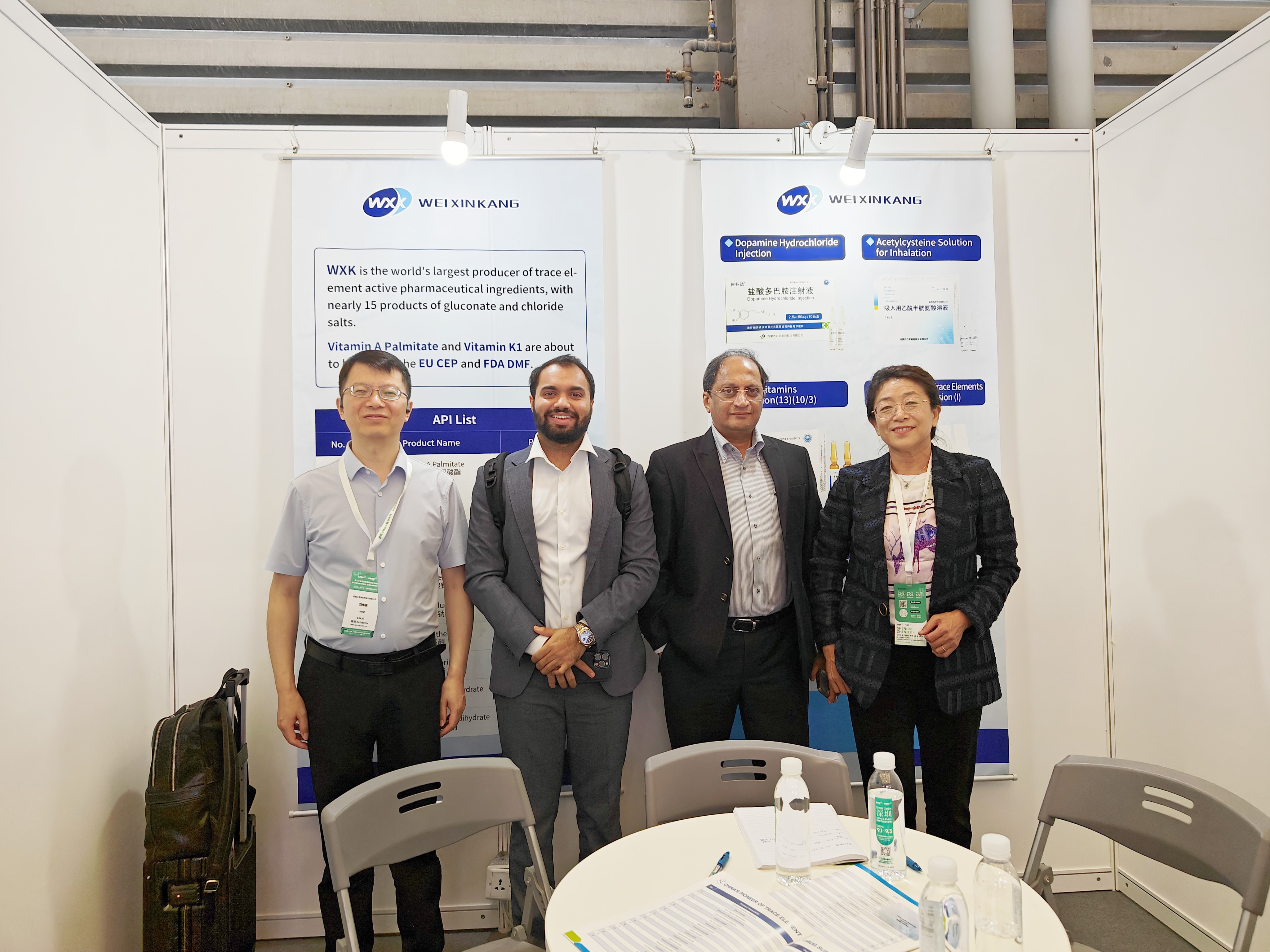 作為在腸外營養領域致力于為全球合作伙伴提供原料、制劑產品及產能綜合解決方案的服務商,衛信康攜微營養素系列原料藥,以及公司重磅制劑:衛優佳??小兒多種維生素注射液(13)、衛素齊??注射用多種維生素(13)(10/3)、依芬達??鹽酸多巴胺注射液、衛苷檸??復方氨基酸注射液(20AA)等產品亮相本次展會,全方位展示了公司在微營養素領域的技術積淀與創新成果。與國際制藥巨頭、創新先鋒及活力新銳同場展示,彰顯了衛信康的卓越實力和顯著競爭力。公司核心產品整齊陳列,吸引了眾多新老客戶駐足觀看和咨詢,國際團隊與來自歐美、印度、東南亞等全球各地客戶進行了熱情且深入的商務洽談,現場人潮攢動,氣氛活躍。