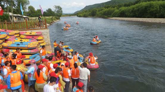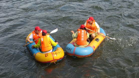 聚集在獵民部落碼頭的員工們三五成群地討論著接下來的游戲項目——水上漂流。大家兩兩一組分別登上了皮劃艇。順著水流一路搖晃,行進漂遠,不時還有擱淺觸石事件,但員工的激情已被點燃,沒有什么能夠阻擋,氣氛十分熱烈。